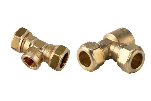 T-stuk koppeling knel-binnendraad 3x, messing, in verschillende aansluitmaten: 15×1/2″x15mm / 22x22x1/2″mm / 28×1/2″x22mm / 28x28x1/2″mm / 28×1/2″x28mm / 28×3/4″x28mm / 28×1″x28mm