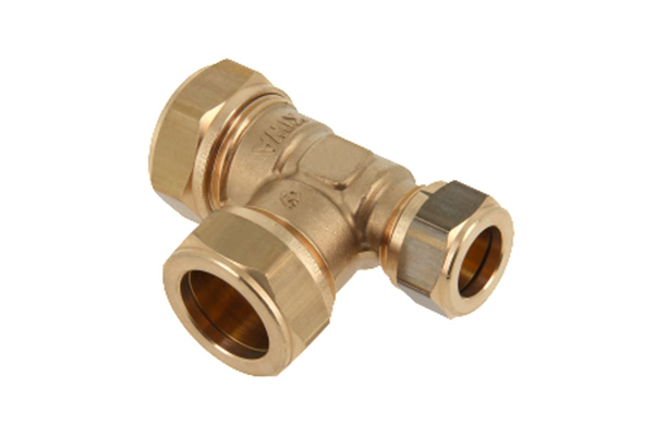 T-stuk koppeling knel 3x, messing, in verschillende aansluitmaten: 22x15x15mm / 22x15x22mm / 22x22x15mm / 28x15x28mm / 28x22x28mm